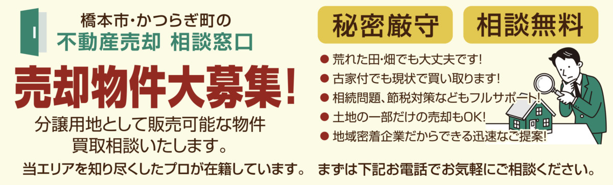 2021年12月21日 お知らせ 【橋本店】売却物件募集中! TwitterLineFacebook共有 弊社では売却物件を募集しています。 荒れた田・畑でも大丈夫です! 古家付でも現状で買い取ります! 土地の一部だけの売却もOK! 相続問題、節税対策などもフルサポート! 査定・見積もりは全て無料です。 是非、電話または「お問い合わせ」よりご連絡ください。 折り返し、担当スタッフより確認のご連絡をさせていただきます。 お知らせ一覧へ戻る カテゴリー 全店お知らせコラムキャンペーンイベントオープンハウス物件情報五條店橋本店店舗別岩出店奈良中央店 最近の投稿 2024.09.17 家づくり大相談会開催! 2024.09.01 【岩出店】夏の生活応援キャンペーン!開催 2024.08.19 【五條店】夏祭り2024開催! 2024.08.04 夏季休業のお知らせ 2024.08.03 【橋本店】3棟同時内覧会開催!