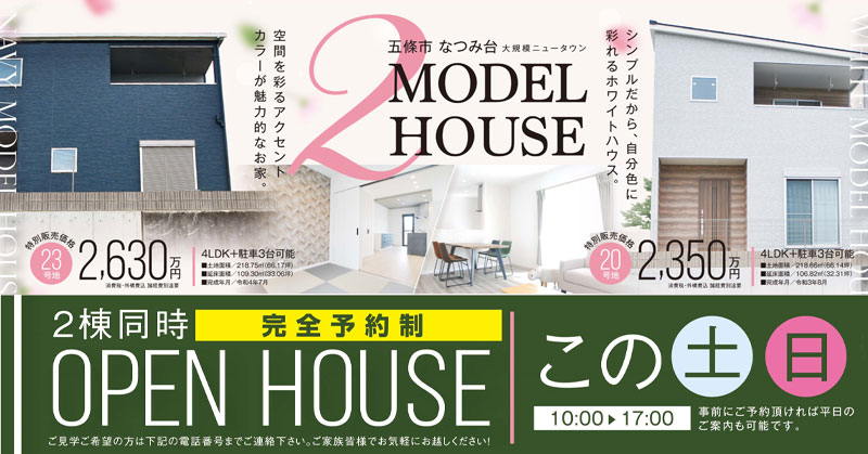 奈良県五條市にあるなつみ台の23号地、20号地モデルハウスにて、オープンハウスを開催いたします。