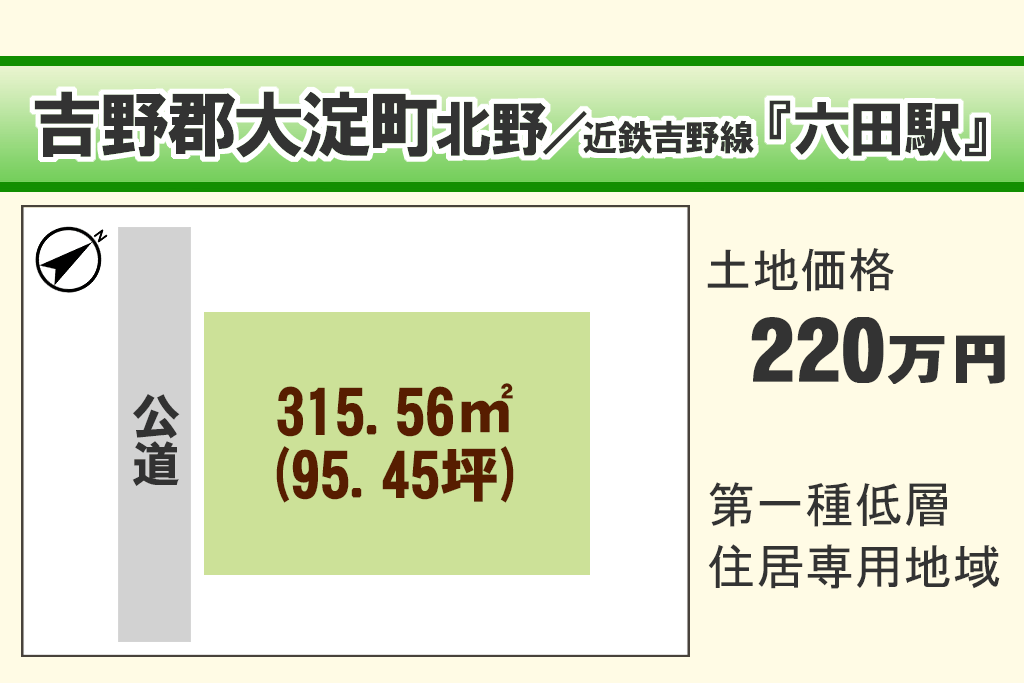 | 最寄駅(沿線/駅名/徒歩) | 近鉄吉野線 / 六田 / 徒歩 20 分 |