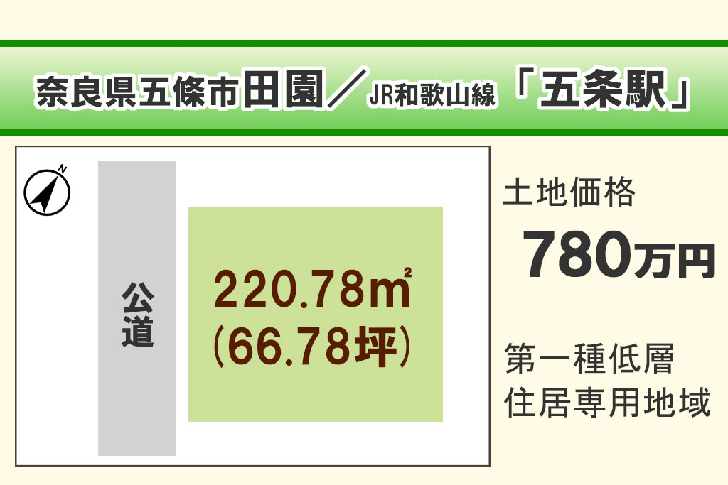 | 最寄駅(沿線/駅名/バス) | JR和歌山線 / 五条駅 / バス停「田園1丁目」より徒歩約2分 |